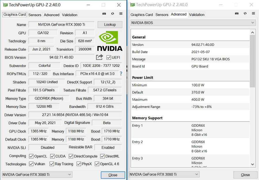 按下一键超频按钮后,iGame GeForce RTX 3080 Ti Vulcan OC的频率从公版的1665MHz超频到了1710MHz,TDP也从350W/380W增加到370W/400W。