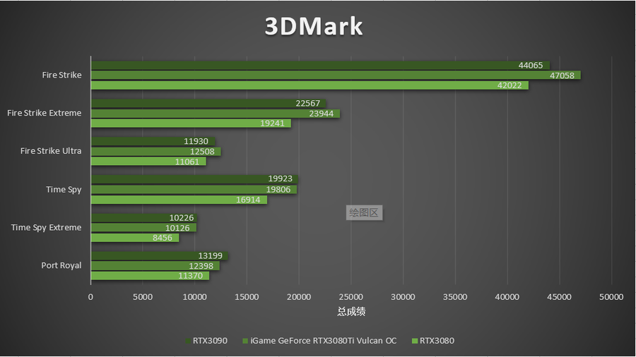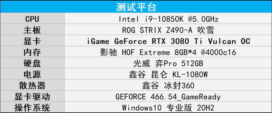 在3DMark基准测试中,iGame GeForce RTX 3080 Ti Vulcan OC在DX12中的表现与公版RTX 3090仅约5%,而在DX11的测试中甚至凭借非公版的高频率小幅反超了RTX3090,光线追踪性能的差距同样不到10%,二者可以说是旗鼓相当,都与RTX 3080拉开了一个段位。