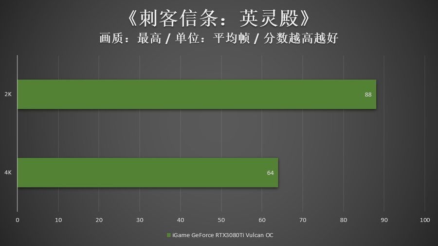 在《刺客信条:英灵殿》和《荒野大镖客2:救赎》两款非光追大作中,iGame GeForce RTX 3080 Ti Vulcan OC无论2K还是4K分辨率都能稳定60帧流畅运行。