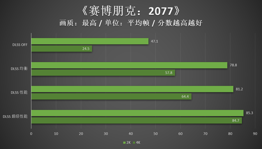 最后是另一款硬件杀手《赛博朋克:2077》,在光线追踪:超级的画质下,iGame GeForce RTX 3080 Ti Vulcan OC开启DLSS-性能就可以在4K分辨率下获得比较流畅的体验,此时相比原生4K下的帧率提升高达164%。而使用2K分辨率的用户只需要把DLSS开启到平衡或者质量档位即可。