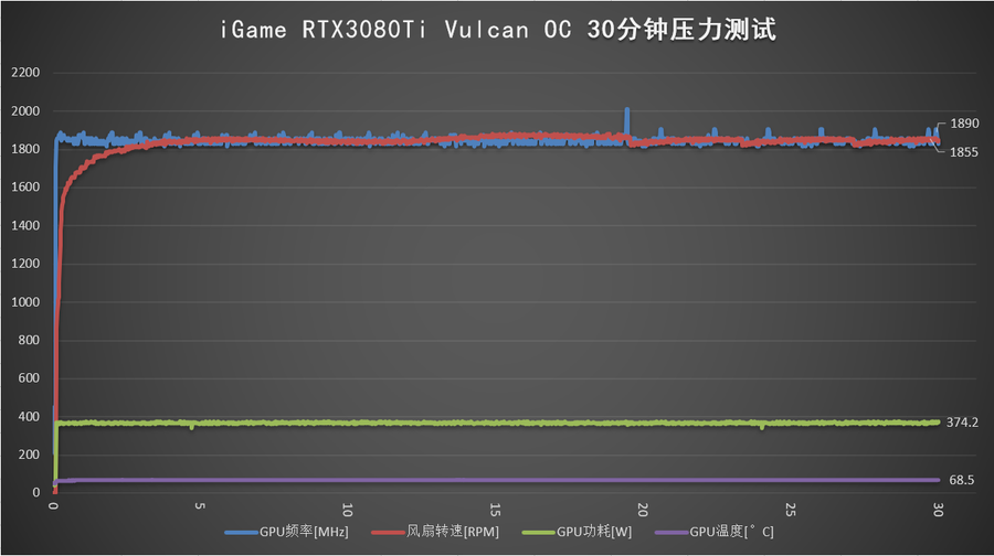 使用3DMark对iGame GeForce RTX 3080 Ti Vulcan OC进行30分钟压力测试,最终频率定在1890MHz左右,功耗约370W,温度68.5°C,风扇1735转,性能、发热表现稳定、良好。(室温25±1°C)