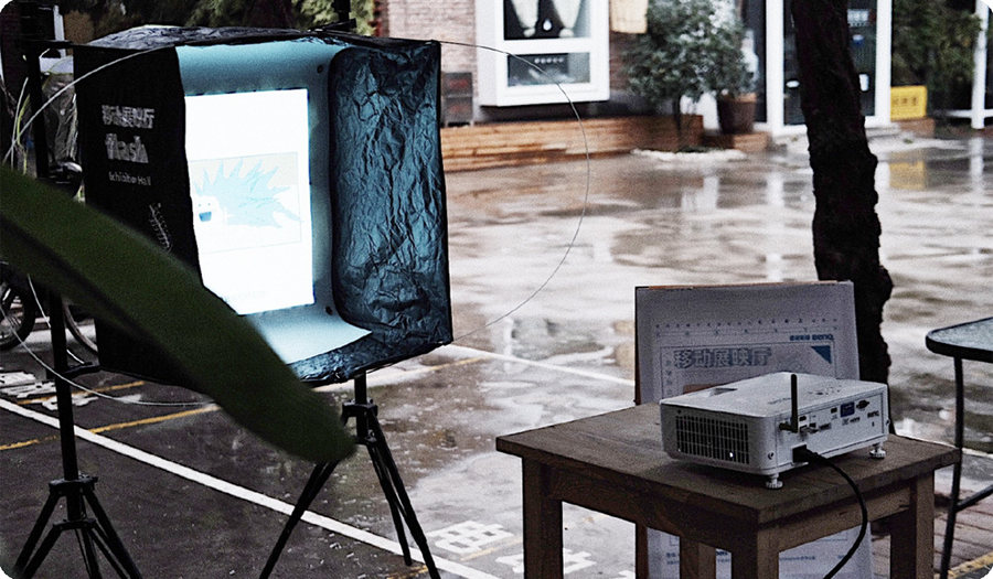 明基E582的投影效果究竟有多好?喜爱用视频、插画分享自己奇思妙想的设计师 @兽桃Loco 就用它成功举办了一场户外的移动展映。