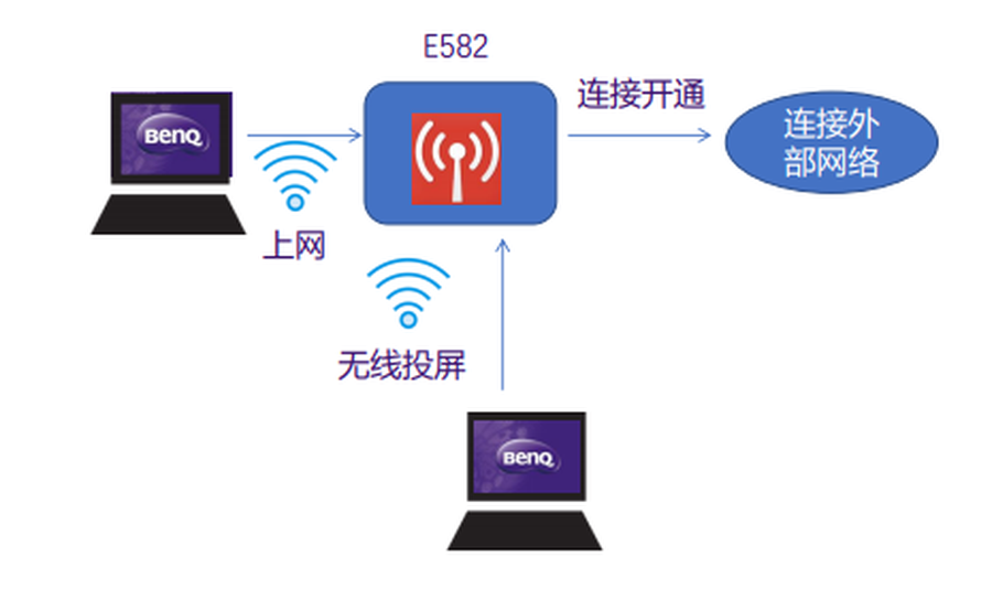 明基E582还内置了双频双路WiFi模块,支持2.4GHz和5GHz无线连接,热点与上网各自独立,实现热点投屏的同时,手机和电脑仍然可以上网。