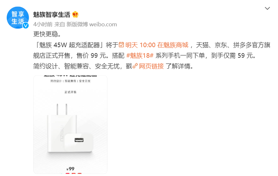 6月14日,魅族宣布魅族 45W 超充适配器将在明天10点正式开售,售价99元。