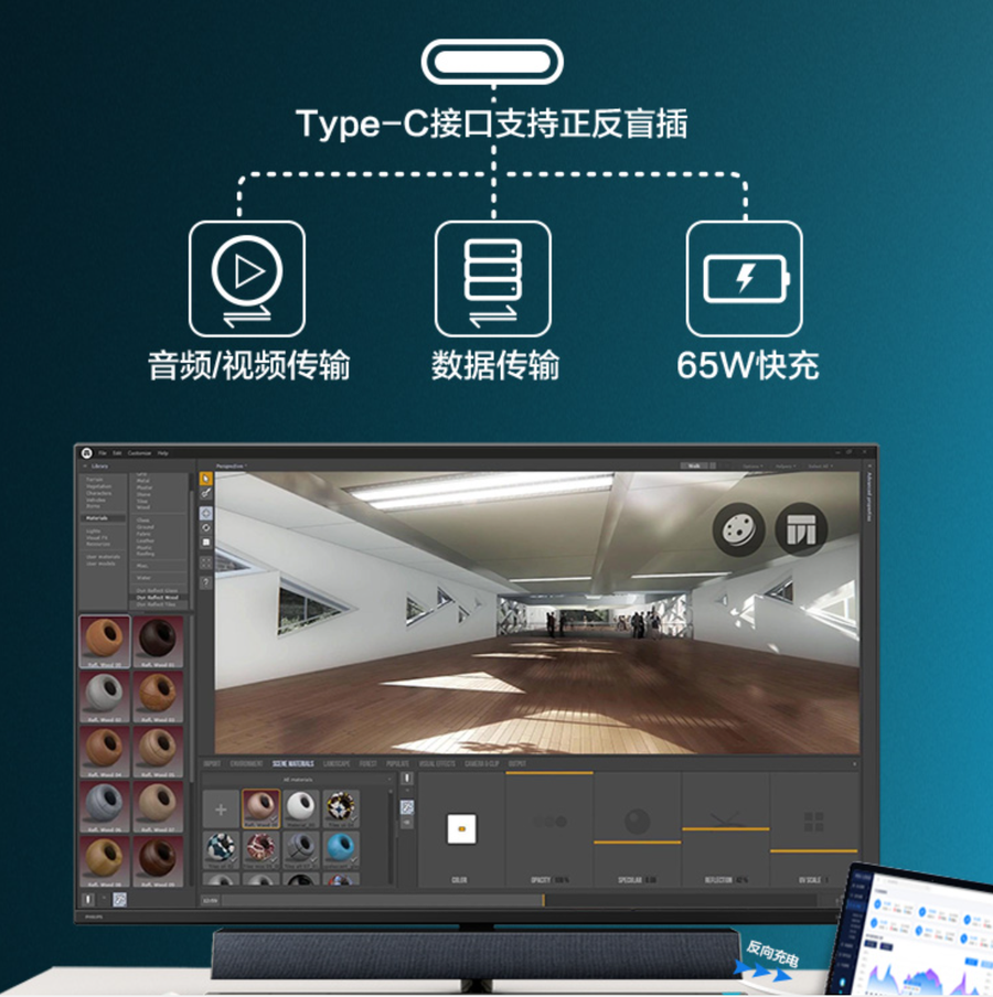 飞利浦559M1RYV显示器搭载的多功能Type-C接口是一个全能型的高性能接口,只需一根线就能实现充电、数据传输、音视频传输功能,不仅能简化连接步骤,也能更好保证桌面整洁。多功能Type-C接口可提供65W供电,部分设备无需单独供电也能放心使用。