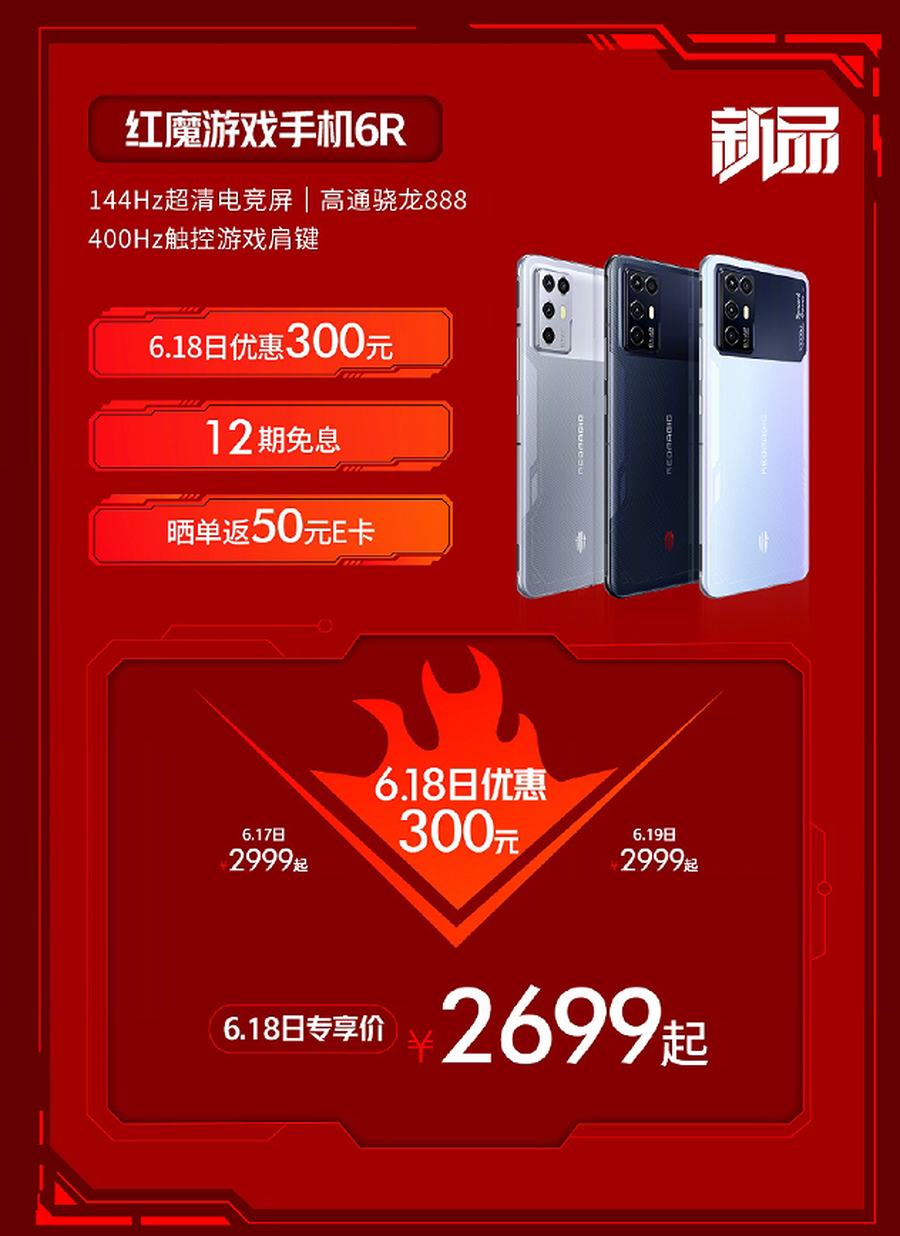 红魔游戏手机6R将于6.18当天直降300元,专享价2699起,更可享12期免息,晒单返50元E卡,感兴趣的朋友可以入手。