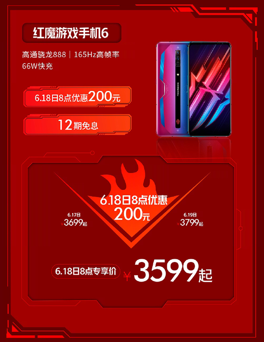 红魔游戏手机6将在6.18日早上8点优惠200元,专享价3599元,购买红魔6手机还可享12期免息。