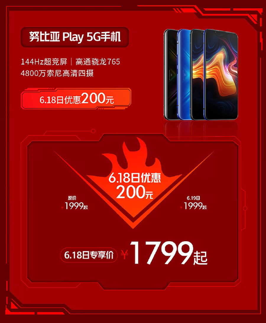 努比亚 PLAY 5G游戏手机在6.18当天将直降200元,限时优惠仅需1799元起。