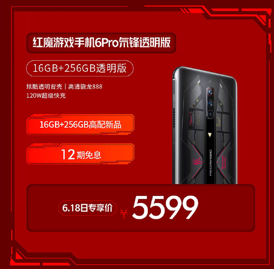 红魔游戏手机6 Pro 在6.18当天专享价4799元起,红魔6 Pro游戏手机氘锋透明板18G+512GB专享价6599元,18G+256GB专享价5599元,红魔游戏手机6 Pro在6.18购买均可以享受到12期的免息福利。