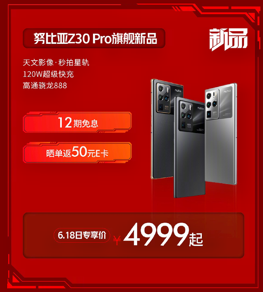 在6月18日,努比亚Z30 Pro优惠价4999元起,晒单返50元E卡,还支持12期免息。
