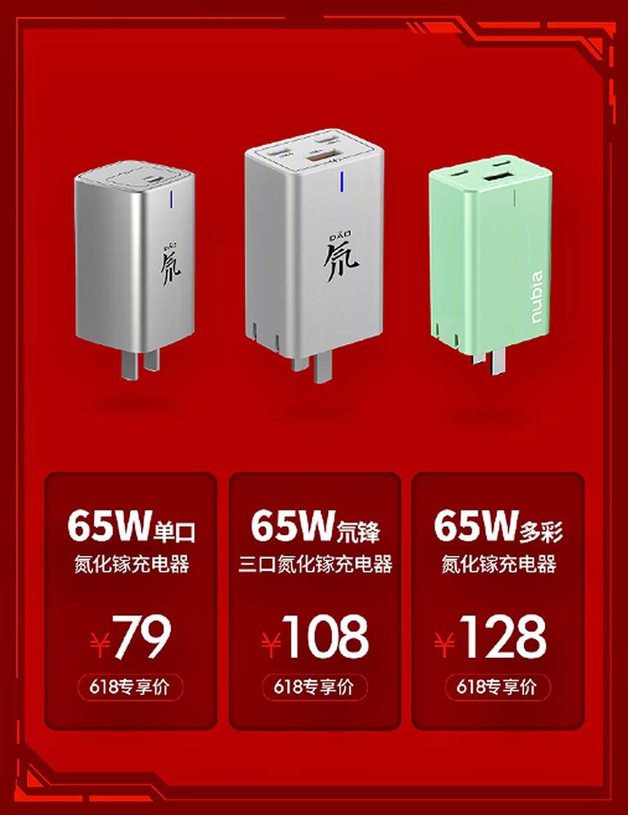 除了上面提到的两款充电器,努比亚超级快充系列充电器也参与此次活动,最低只需79元。