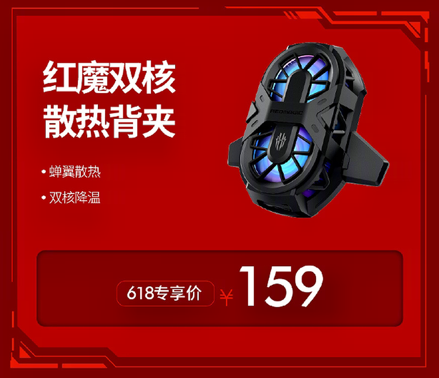红魔双核散热背夹采用蝶翼拓展式散热设计,产品宽度更小的同时,增大制冷面积。红魔双核散热背夹内置两个风扇,拥有双半导体制冷原材加持,双核降温更高效。红魔双核散热背夹内置RGB灯带,玩家可自定义灯光效果,这款产品618专享价159元。