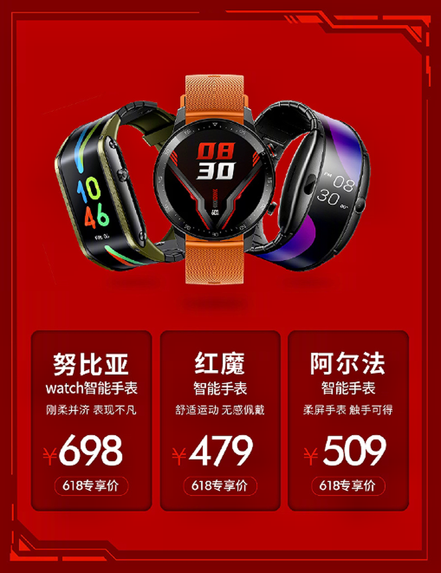 除手机和充电配件以外,努比亚&红魔生态产品也参与618大促。红魔智能手表、阿尔法智能手表、努比亚Watch智能手表三款智能穿戴手表低至479起,优惠幅度同样很大,值得一买。