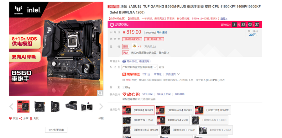 对于打算近期装机的用户来说,618是一个不可错过的时机。如果你想要购买一块主板,华硕就有不少热门主板值得考虑,华硕B560重炮手就是一款具有较高性价比的热门主板。华硕B560重炮手目前在京东闪购价只需819元,现在购买更加优惠。