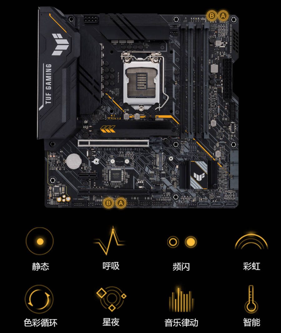 华硕B560重炮手配备可编程的RGB LED灯,提供丰富的灯效预设模式和控制选项,还支持与AURA SYNC硬件设备进行灯效同步,打造出炫酷的电竞氛围。