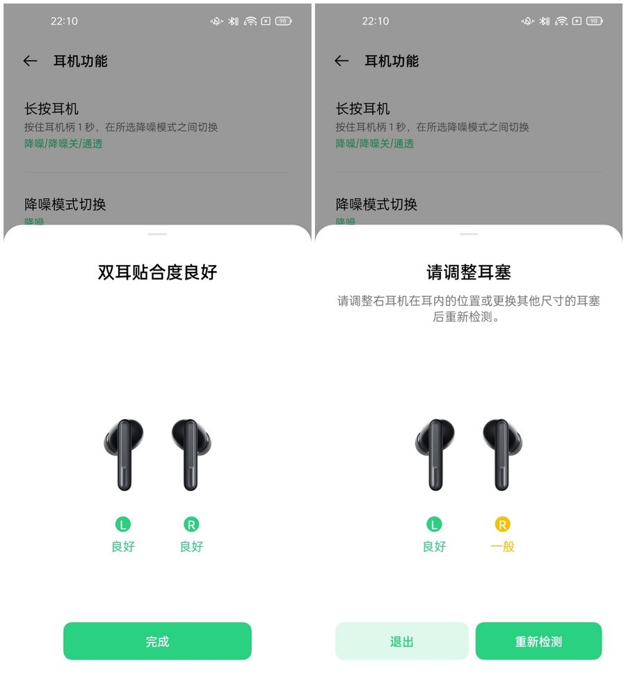 如果你不知道佩戴是否贴合也没关系,通过耳机贴合度检测功能,可以查看当前的佩戴贴合度。比如系统检测到耳机贴合度不好,你就可以更换耳帽或者调整佩戴方式。