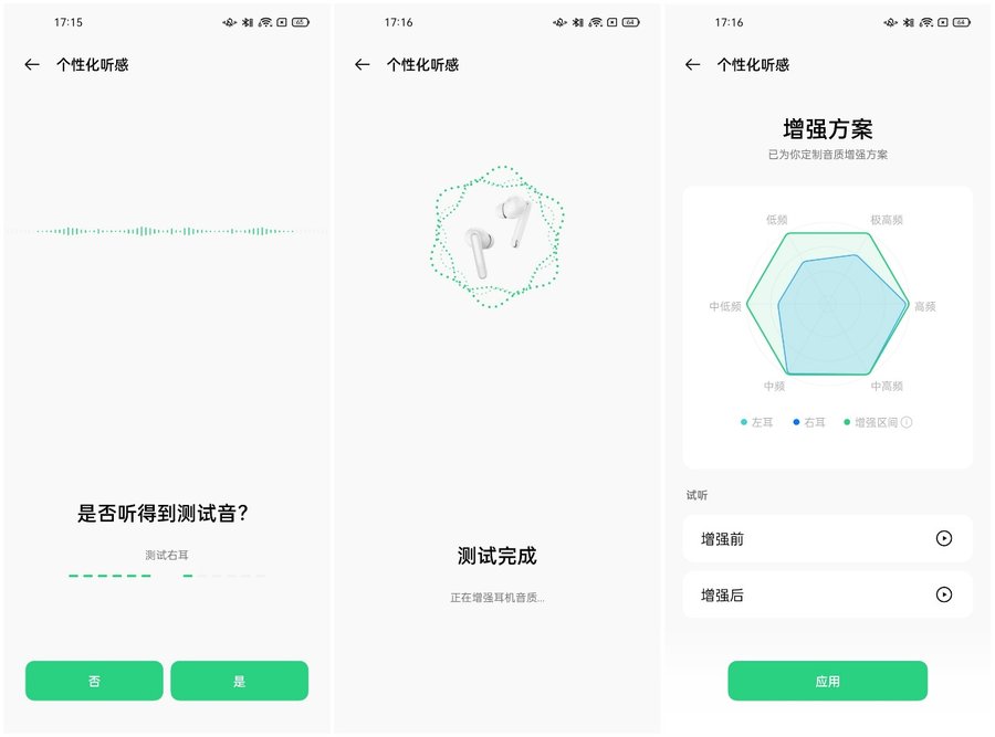 上面音质部分的体验其实属于比较主观的,不同人可能会有不同的认知,或者对不同频段的敏感度不同,使用同样的设备也可能会有不同的体验。为了解决这个问题,OPPO Enco Free2加入了个性化听感功能,能够根据每个人的听音敏感度特征,定制个性化的声音补偿方案。