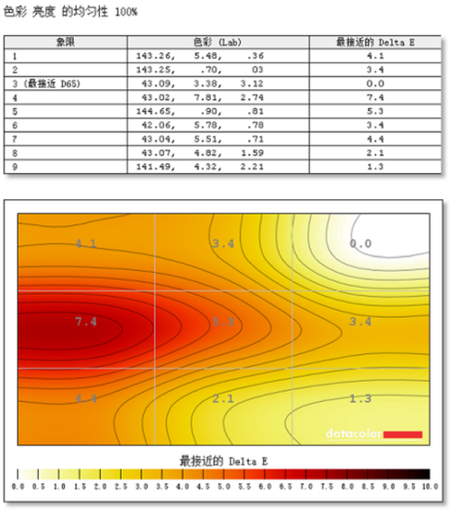 测试小结:在D65标准中,色温值为6500K表示色彩比较准确,不会出现偏冷或者偏暖。通过测试可知,这款显示器右上角区域(3号测试区域)最接近D65的标准。屏幕整个左下角区域(4号测试区域)偏差最大,差值为9.0。