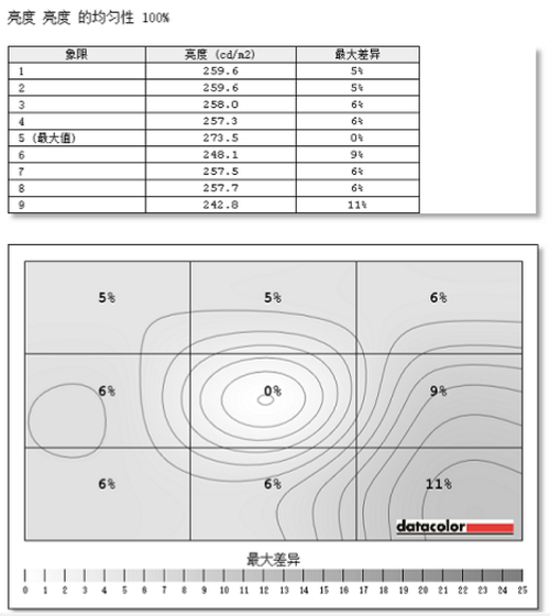 在亮度均匀性方面,这款显示器中心区域(5号测试区域)亮度最高,达到了273.5cd/m2。它的右下角区域(9号测试区域)亮度偏差最大,差值达到了11%。