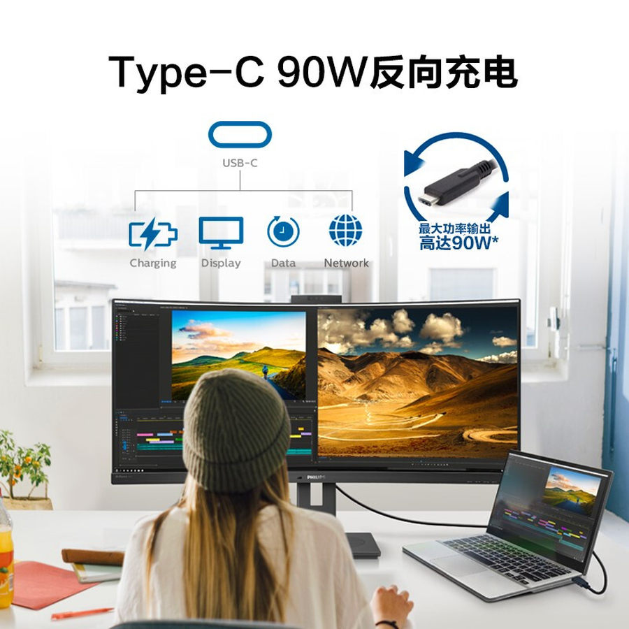 飞利浦346P1CRH显示器集成了丰富的接口,拥有全功能Type-C接口(USB 3.2 Gen2),可满足高速数据传输、视频传输等需求,支持正反盲插,使用起来非常方便。这个接口最高可提供90W反向供电,能够给笔记本、手机等智能设备供电,外接设备时更方便,不用单独外接供电。