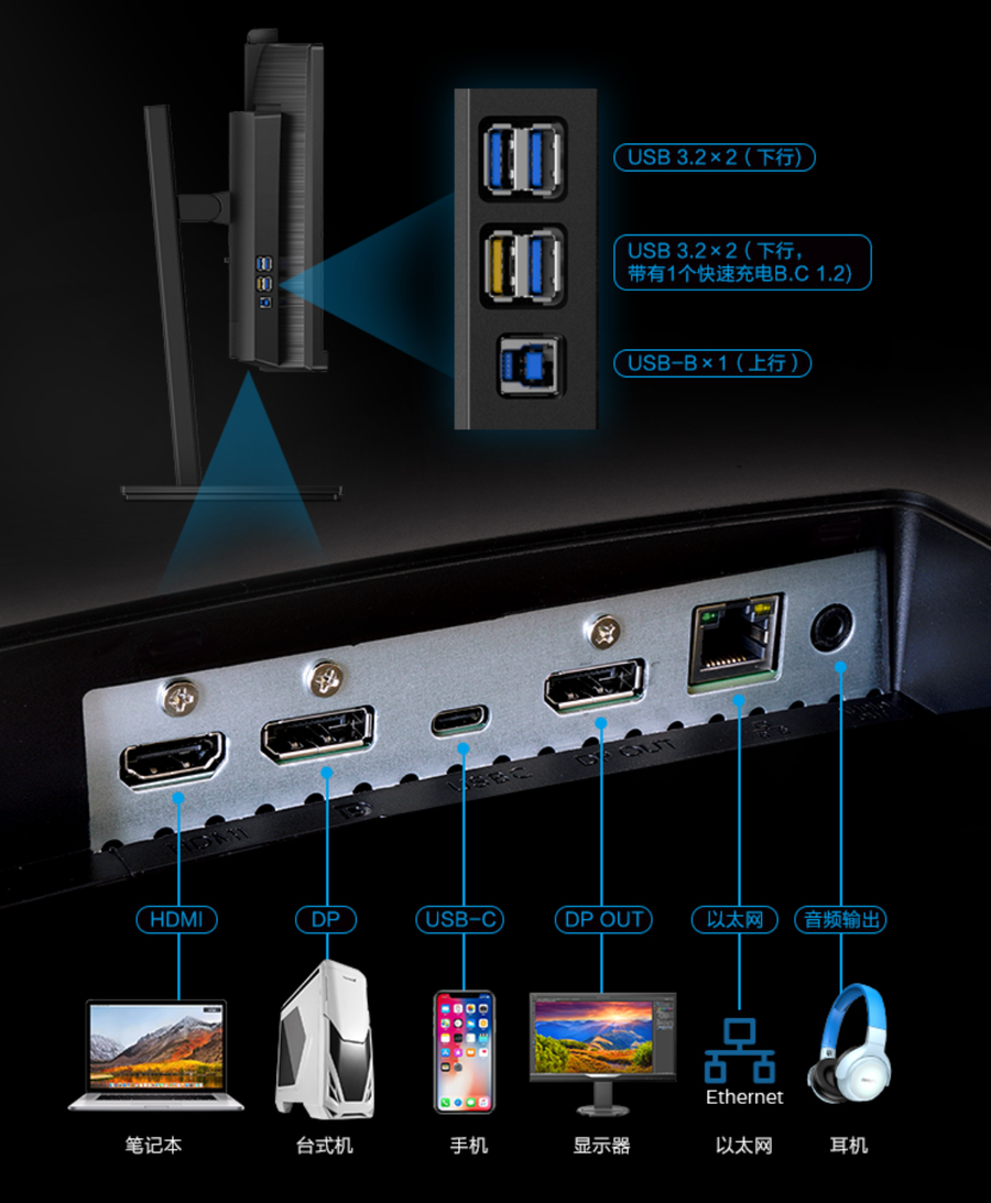 另外,这款显示器还配备一个HDMI接口、两个DP接口(其中一个为输出)、一个以太网口、一个3.5mm耳机接口、四个USB 3.2接口以及还有一个USB-B上行接口,轻松满足用户的各种外接需求。