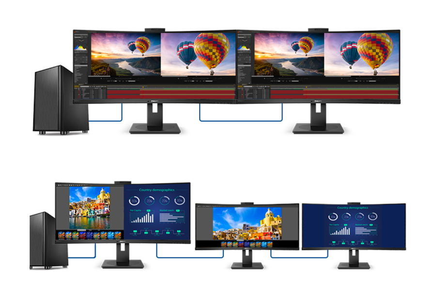 飞利浦346P1CRH显示器还可通过DP线连接,让多台显示器实现“串联” 显示效果,实现电脑画面的扩展或复制等,需要用到多屏的用户实现起来也非常简单。