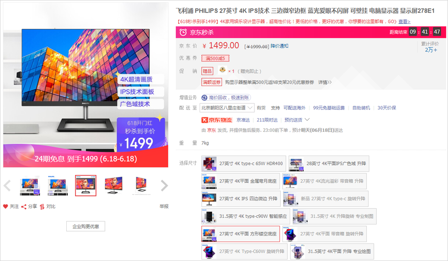 想买一台娱乐办公皆不错的4K大屏显示器,眼下这个618大概需要多少钱呢?飞利浦278E1只要1499元。是的你没看错,只要1499元!并且还可叠加24期免息福利。怎么样,是不是很香!