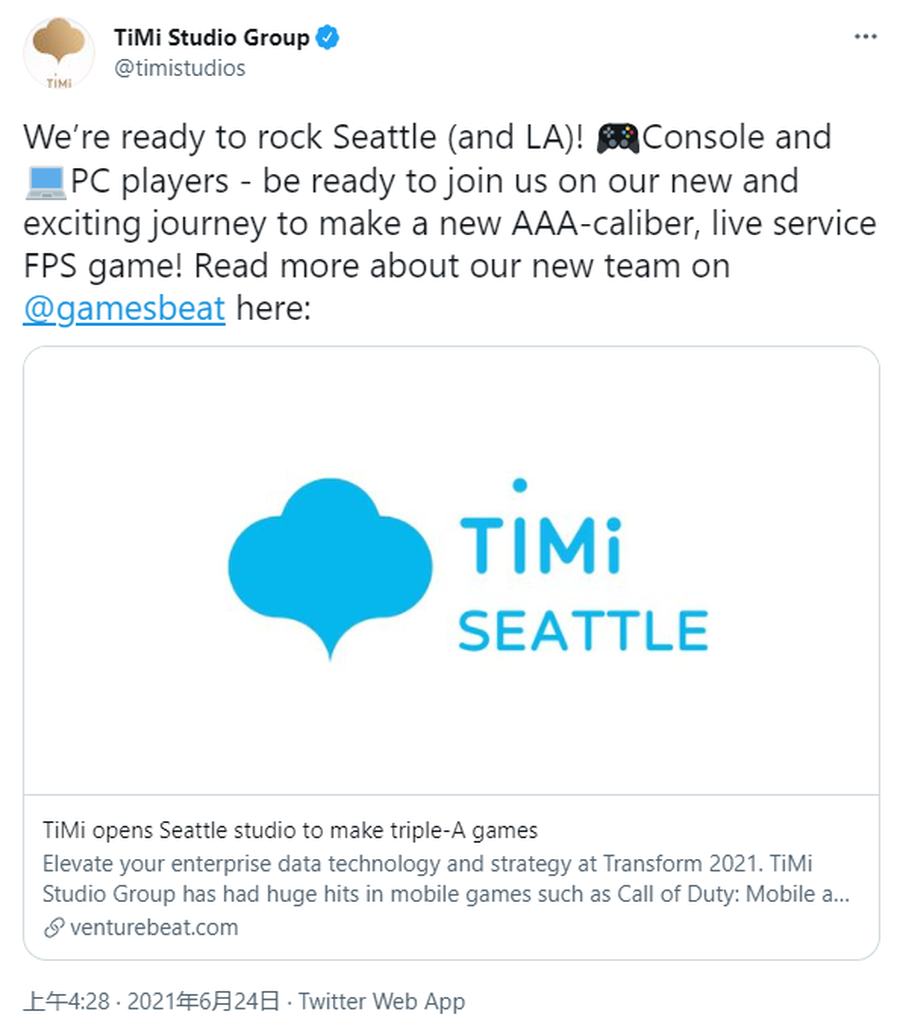 6月24日消息,腾讯天美宣布其开设了一个全新的工作室部门。此次腾讯天美开设的新工作室为腾讯天美西雅图工作室,据悉腾讯天美西雅图工作室将致力于开发 PC 和主机端的射击类 3A 大作。