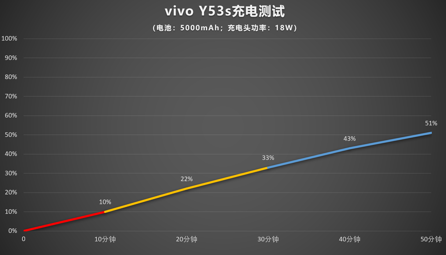 vivo Y53s内置5000mAh大电池,支持18W充电,充电续航部分我们进行了实际测试。