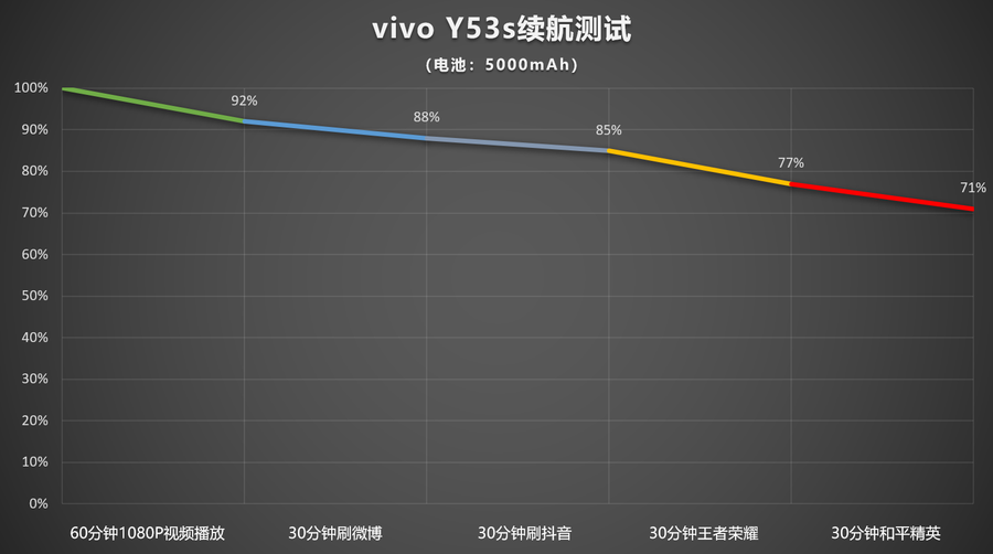 续航方面,从100%的电量开始测试,屏幕亮度为50%,90Hz刷新率模式,具体测试结果如上。经过3小时的连续续航测试,vivo Y53s剩余电量还有71%。续航方面能有这样的表现是很不错的,相信应对一天工作日没啥压力。