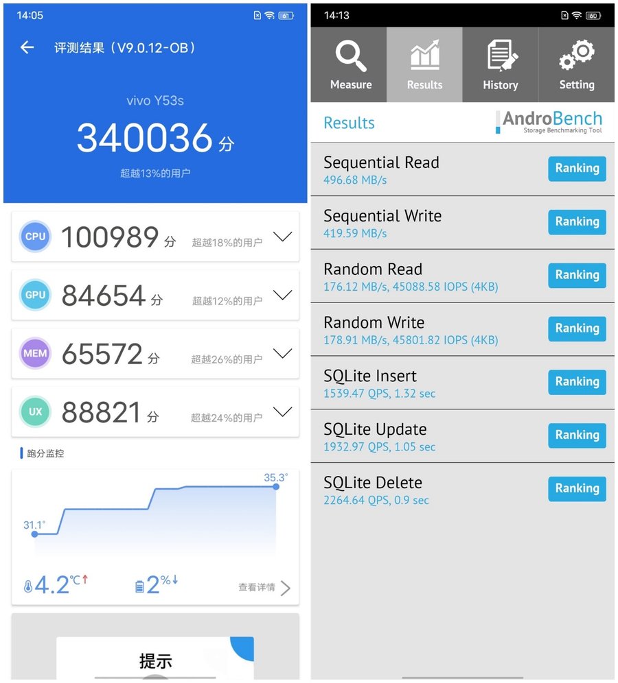 在跑分上,vivo Y53s安兔兔V9版本跑分达到34万+,可以轻松应对日常使用需求,我们也选取了《王者荣耀》以及《和平精英》这两款热门游戏进行实测。