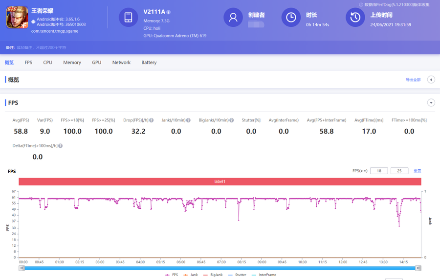 在特效全开的画质设置下,《王者荣耀》的平均帧数为58.8帧,游戏整体流畅度比较好,不过在多人团战这类复杂的高负载场景,帧数会有一定的波动。vivo Y53s的整体游戏体验还是不错的,游戏中移动视角、操作放大招等操作响应都比较迅速。