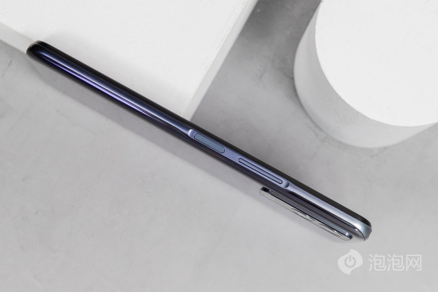 机身背面做了3D弧面处理,贴合手掌,机身背面整体与中框过渡自然,只有四角处的过渡没那么自然。值得一提的是,手机中框部分颜色根据背面效果做了渐变呼应,一体感更好。