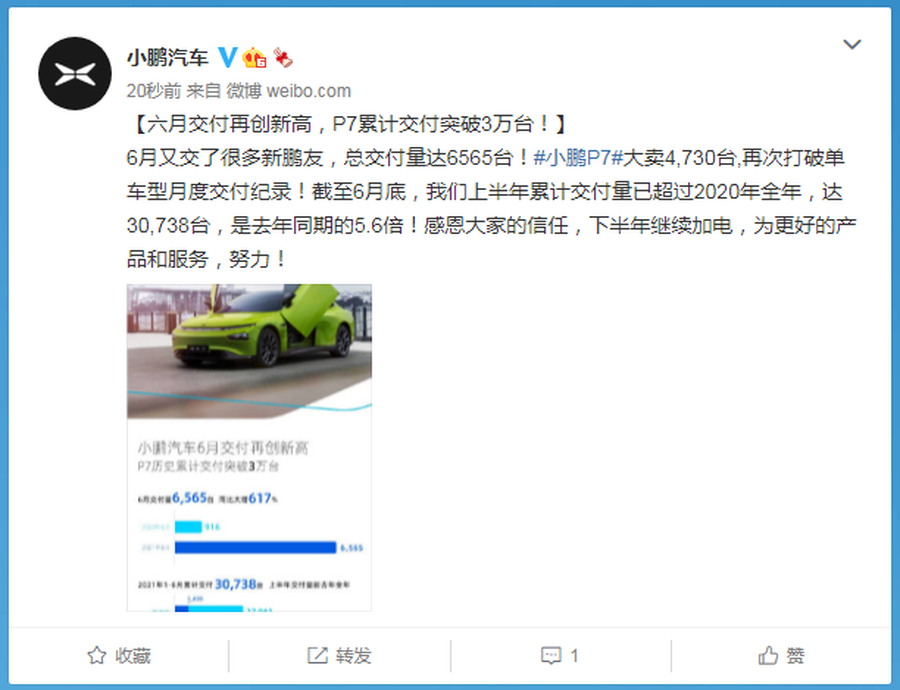 来自小鹏官方微博的新消息。小鹏P7六月份交付量再创新高,达到了6565台!同时,小鹏P7累计交付量已突破3万台!