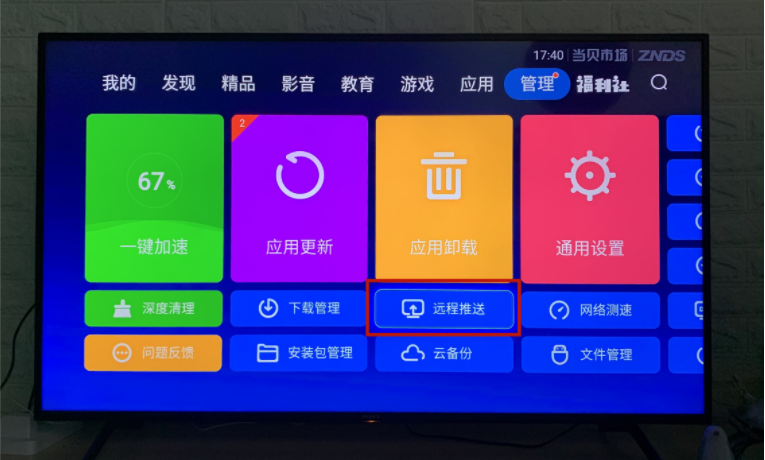 2、依旧是在电视上打开当贝市场,找到【管理】栏目中的【远程推送】