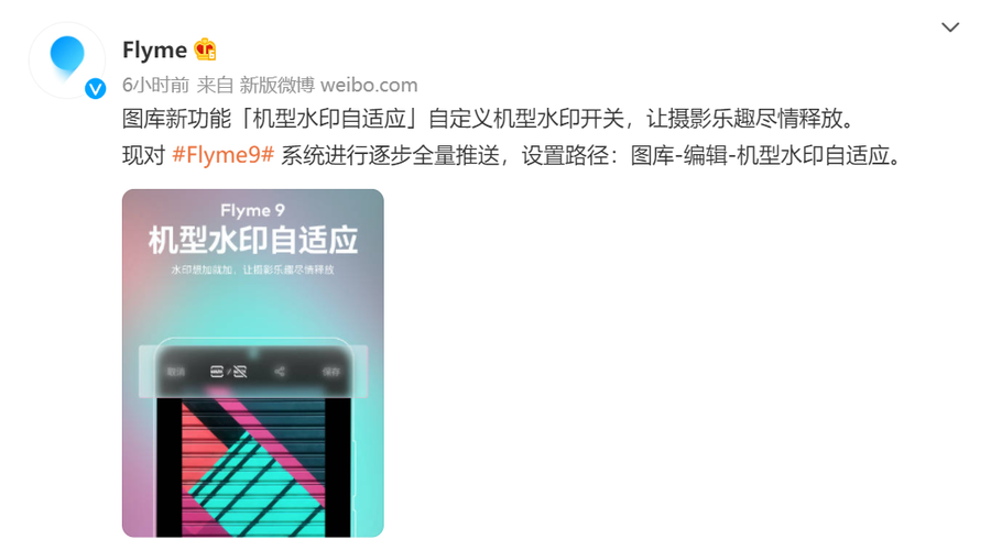 7月12日,Flyme宣布,魅族Flyme9的图库增加机型水印自适应新功能,并且进行逐步全量推送。