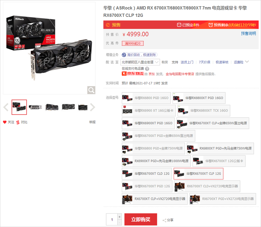 华擎三风扇RX6700XT显卡在京东商城某第三方店铺已低至4999元,商品为京东发货。RX6700XT的游戏性能跟NV家的RTX3060Ti差不多,畅玩2K游戏无压力。