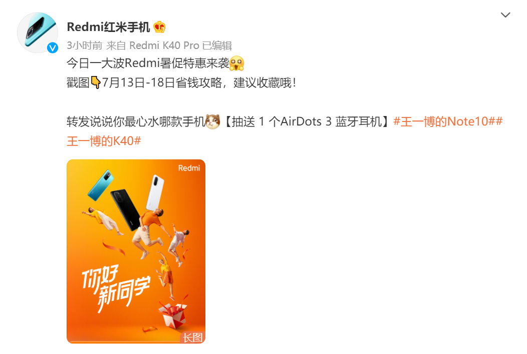 7月13日,Redmi红米手机宣布,一大波Redmi暑促特惠来袭,K40、Note10 Pro等多款手机参与优惠活动,最高可优惠300元,活动时间为7月13日到18日。