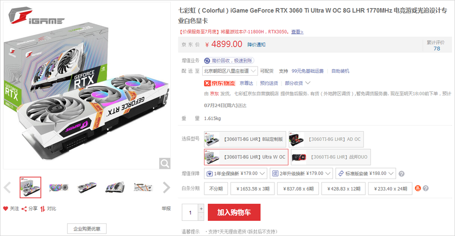七彩虹iGame GeForce RTX 3060 Ti Ultra W OC 8G LHR显卡目前售价为4899元,着急用卡的玩家们值得入手。锁算力版本,游戏性能不受影响。