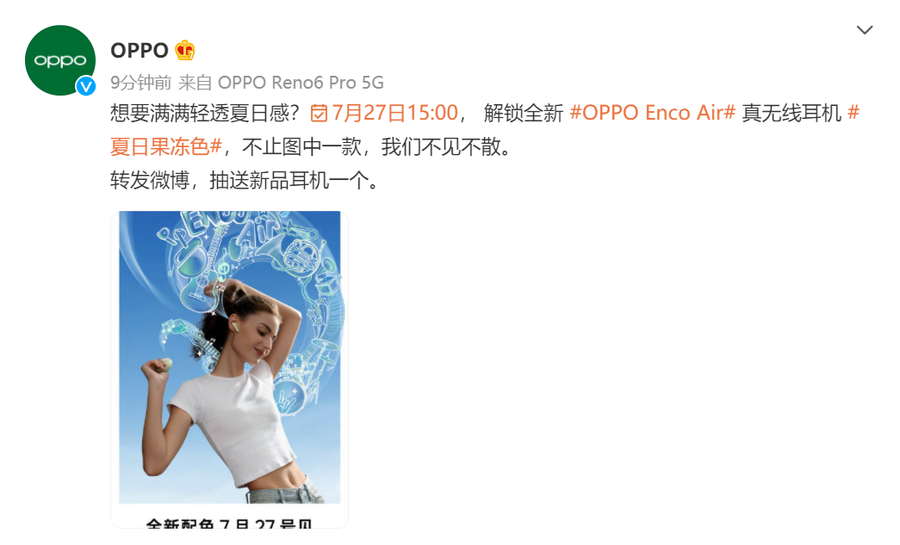 根据预热微博,这次OPPO Enco Air真无线耳机将会推出全新夏日果冻色,除了海报中的绿色版本,还会有蓝色版本。充满活力的蓝色、绿色与半透明果冻仓搭配,让这款产品更加时尚潮流,带来夏季清凉感,非常适合追求时尚的潮流青年,甚至能成为时尚潮搭单品。