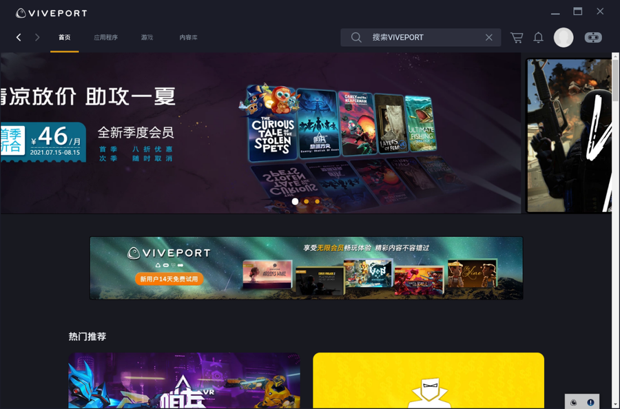 VIVEPORT内容商店的应用分为免费和收费两种,如果不想单独购买某个游戏,还可以通过VIVEPORT内容商店提供的会员服务成为会员。无限会员订阅的月费为58元一个月,成为会员后就可以畅玩VIVEPORT内容商店中绝大部分游戏内容,相较之下比单独购买游戏更为划算。