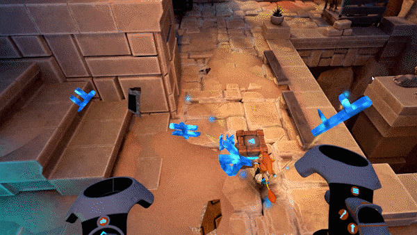 以往我们玩这种闯关游戏,一般都是2D的画面,在HTC VIVE Pro 2的加持下,则可以实现3D的视觉效果。同时,以前玩游戏我们都是平视画面,而HTC VIVE Pro 2则可以让你以“上帝视角”进行游戏。