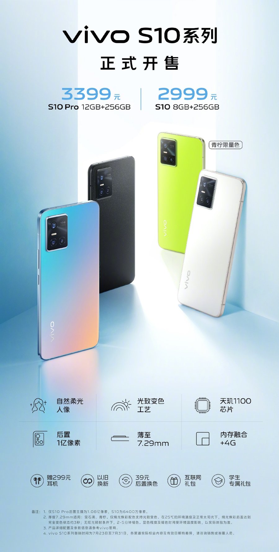 7月23日,vivo S10系列正式开售,vivo S10 8GB+128GB目前优惠价只需2699元。vivo S10系列是新一代潮流自拍旗舰,配备前置4400万像素柔光双摄,延续轻薄设计的同时,还在绮光焕彩配色上实现了光致变色效果,带来全新体验。