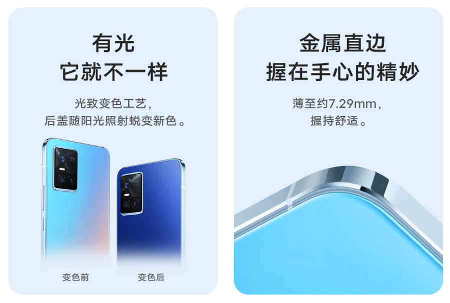 vivo S10系列拥有绮光焕彩、萤石黑、丝绒白、青柠四种配色可选,其中绮光焕彩版本采用“光致变色”工艺,在阳光照射后会变成克莱因蓝的色彩效果。萤石黑与丝绒白分别采用了最新的“萤石AG工艺”与“丝绒AG工艺”。