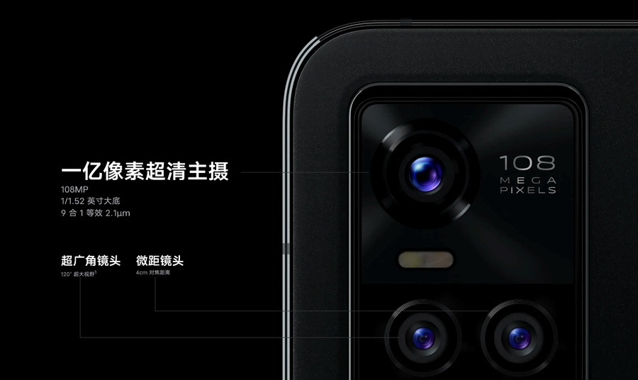 vivo S10系列后置为三摄组合,其中vivo S10 Pro后置主摄为1.08亿像素,拥有1/1.52英寸传感器面积,支持像素9合1,单像素面积可达2.1μm,还有800万像素超广角和200万像素微距镜头加持。