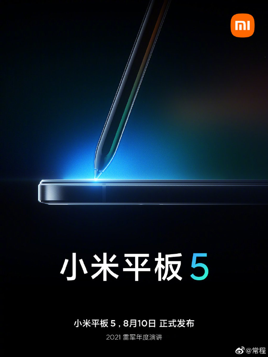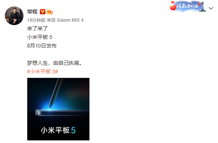 8月6日消息,小米高管——常程在社交平台官宣了小米平板5的到来,并且宣布将在8月10日连同小米MIX4一起推出。
