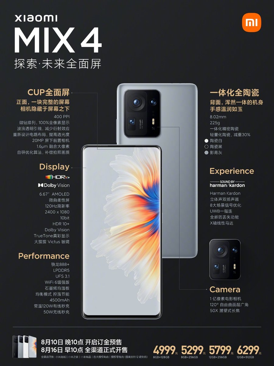 8月16日,小米MIX 4正式开启首销,8+128GB版4999元,8GB+256GB 版5299元,12GB+256GB 版5799元,12GB+512GB版6299元。