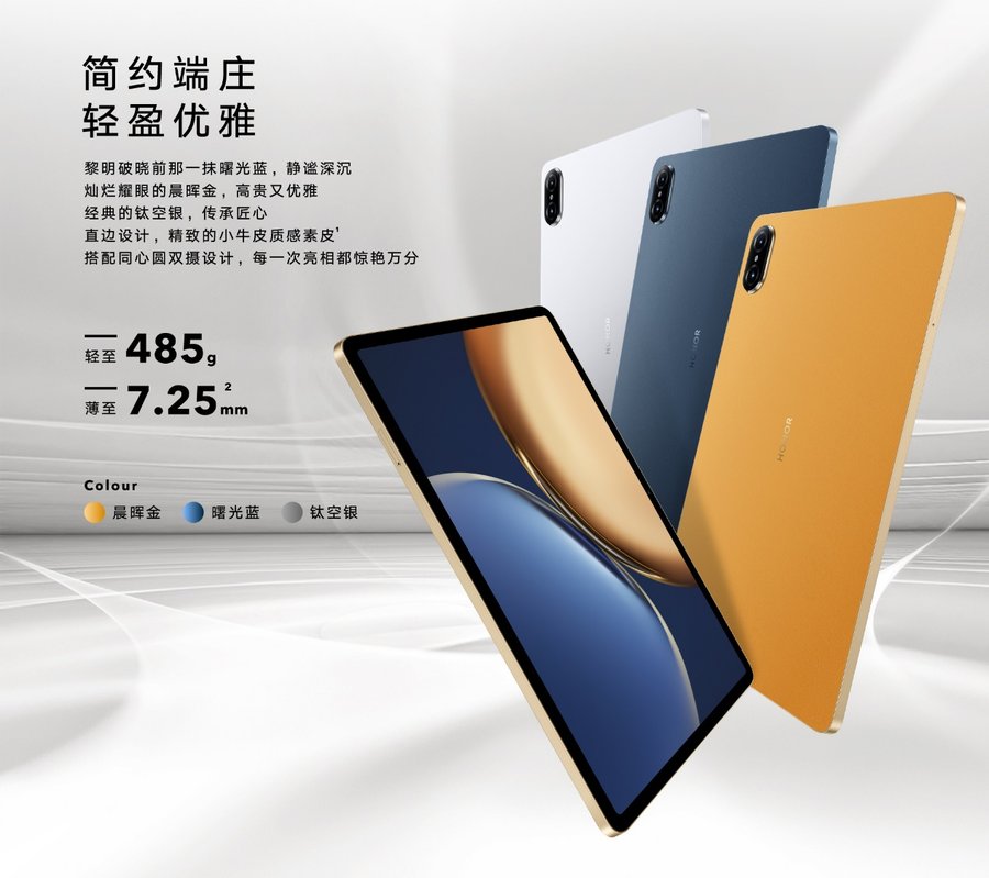 荣耀平板V7 Pro拥有晨晖金、曙光蓝、钛空银三种配色可选,采用直角中框设计,厚度为7.25mm,重量485g。产品配备了11英寸2.5K(2560×1600)屏幕,支持120Hz刷新率(支持自适应调节)以及DCI-P3广色域,屏占比达到86%。这块屏幕通过德国莱茵TÜV Full Care 2.0认证以及国家眼科工程中心护眼认证,支持硬件级低蓝光护眼。