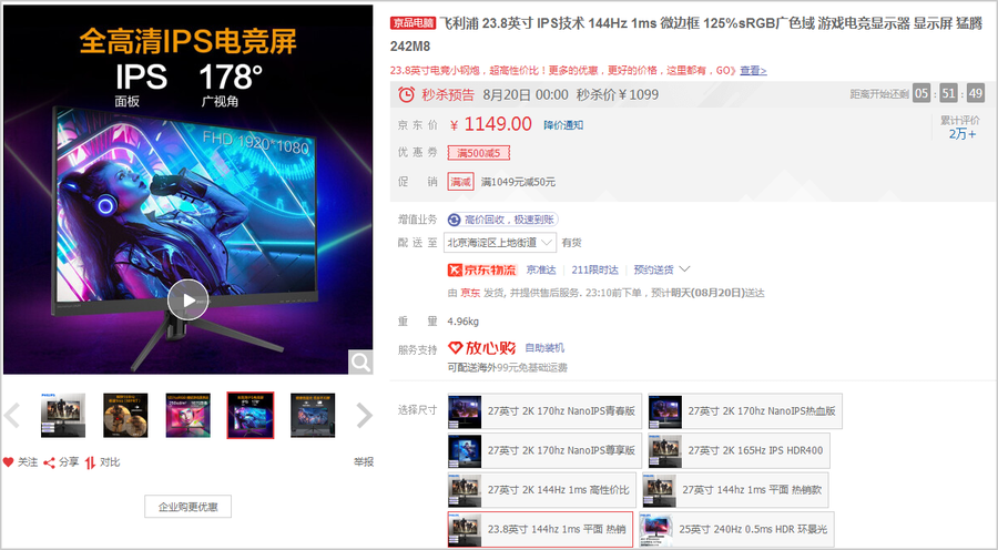 飞利浦242M8是一款性价比超高的游戏性能强,画质好,还支持144Hz高刷,已能够满足大量玩家们的需求。8月20号当天,这款显示器在飞利浦京东自营旗舰店限时特惠价仅1099元,值得入手。