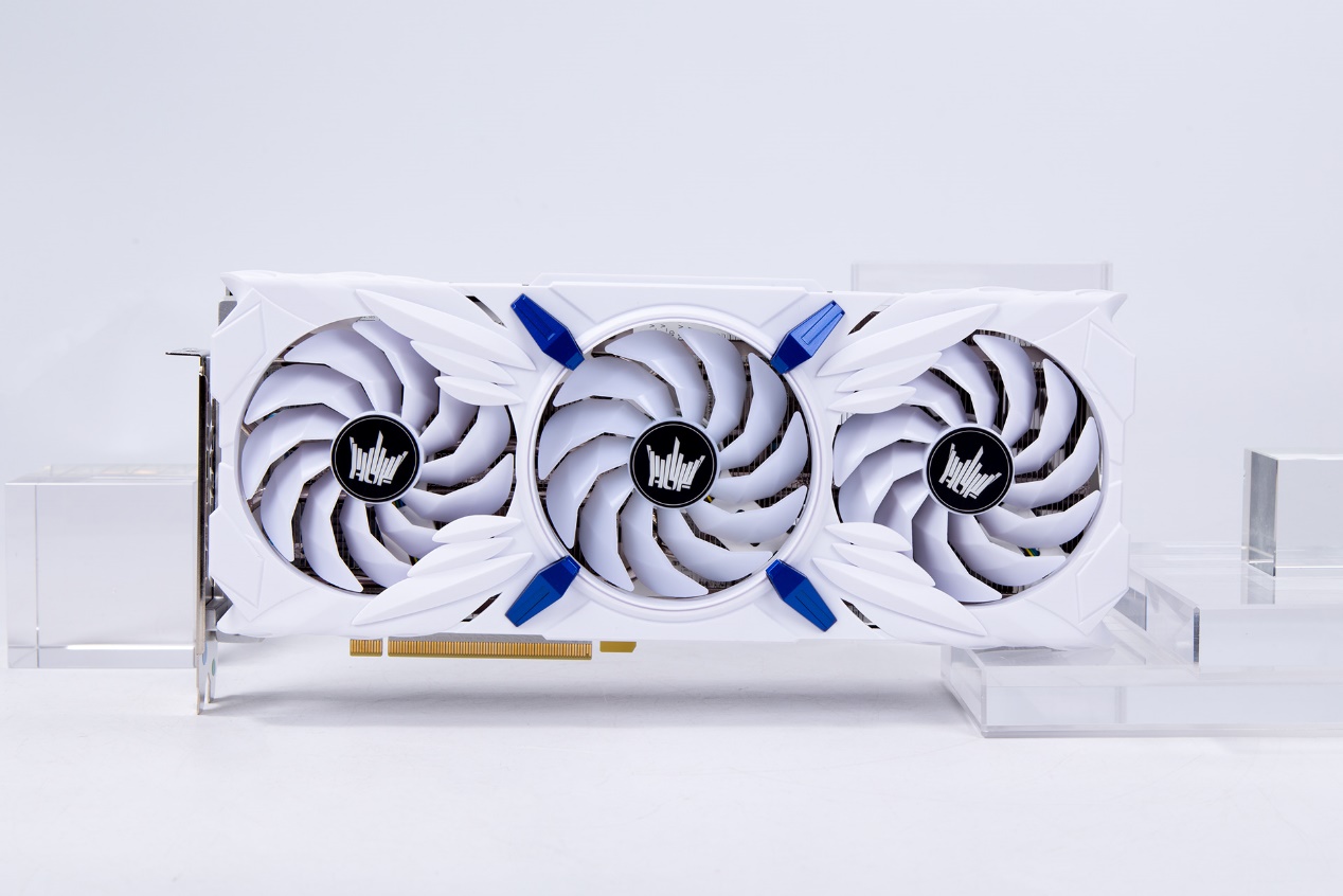 显卡的散热系统为“大天使散热器”,正如该名称所说,显卡外观具有很多天使羽翼的元素,配合中间的ARGB风扇,能展现出独具风格的外貌。